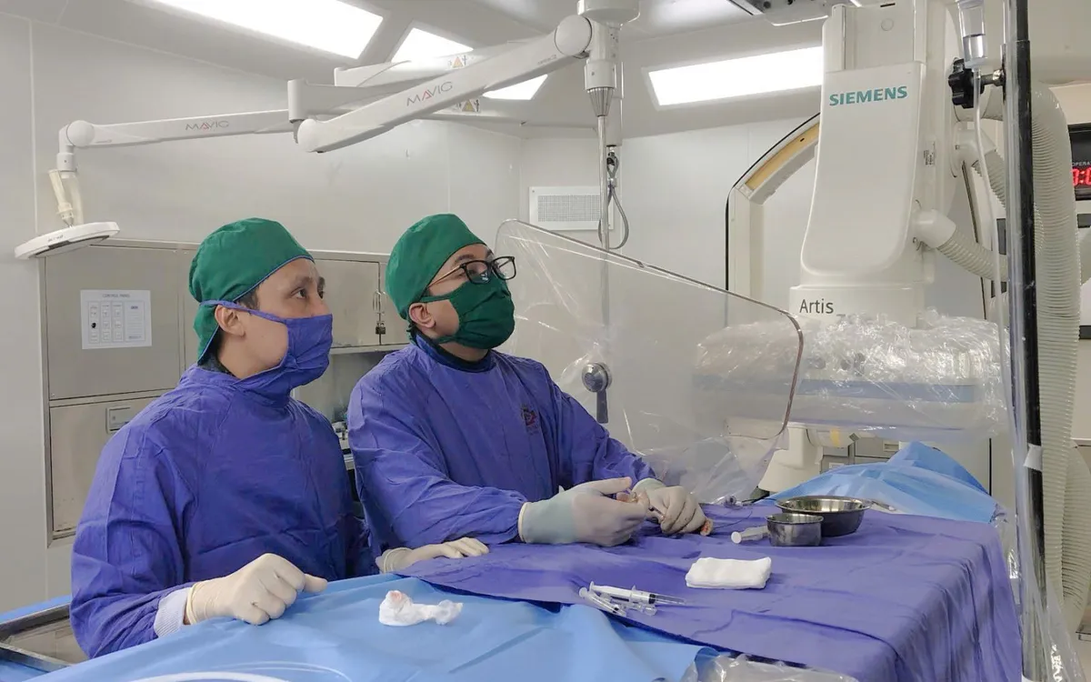 Hội chẩn liên chuyên khoa đã quyết định can thiệp nút mạch cấp cứu nhằm vừa kiểm soát chảy máu, vừa bảo tồn tử cung. Kíp can thiệp do BS.CKII Ngô Quang Chức – Trưởng khoa Chẩn đoán hình ảnh và BS.CKI Đào Văn Đạt thực hiện dưới hướng dẫn hệ thống DSA, sử dụng keo sinh học và coil để nút tắc triệt để các nhánh động mạch tử cung cấp máu cho ổ dị dạng. Sau can thiệp, tình trạng xuất huyết được kiểm soát, sức khỏe bệnh nhân ổn định, không biến chứng.